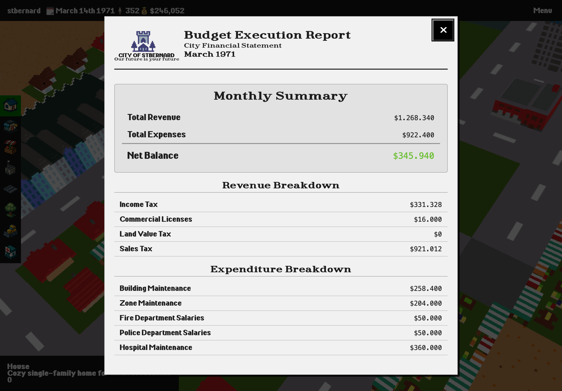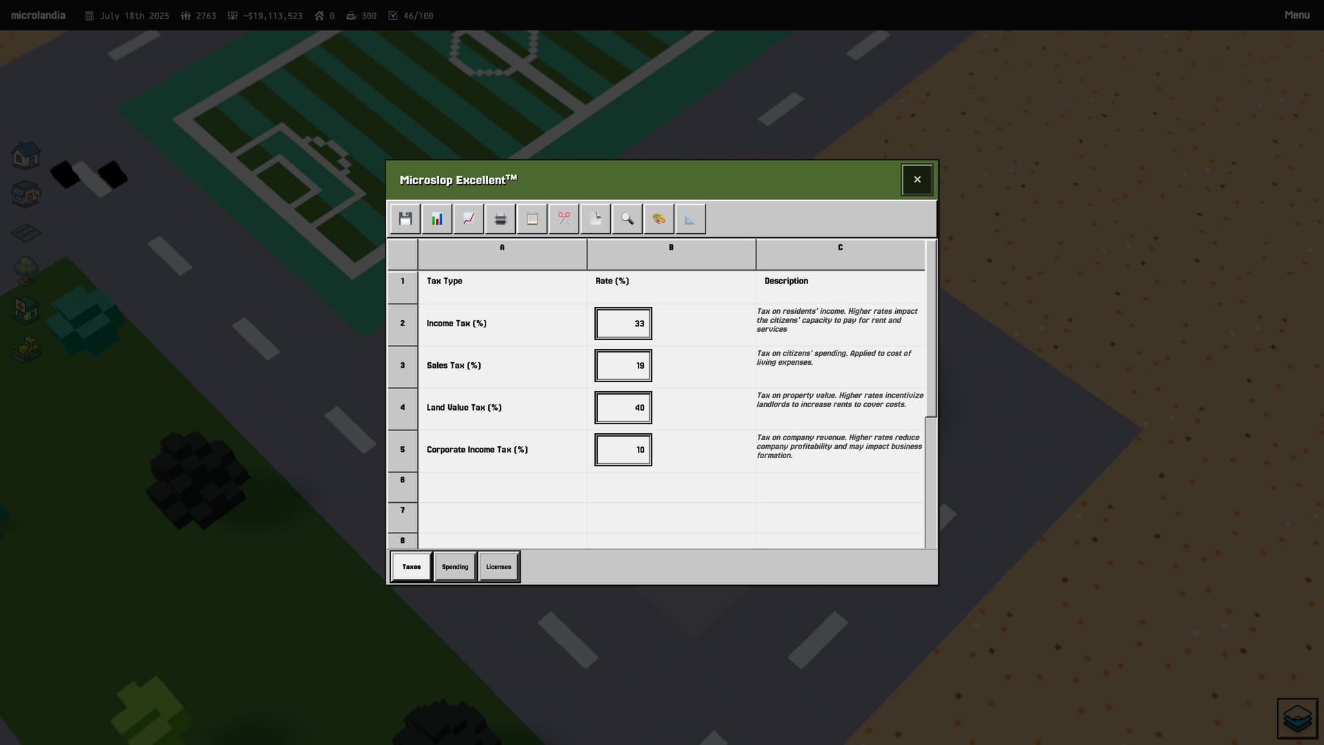 - 💰 Tax rates for property, income, sales and corporate sales changes affect the economics of your city in complex ways.