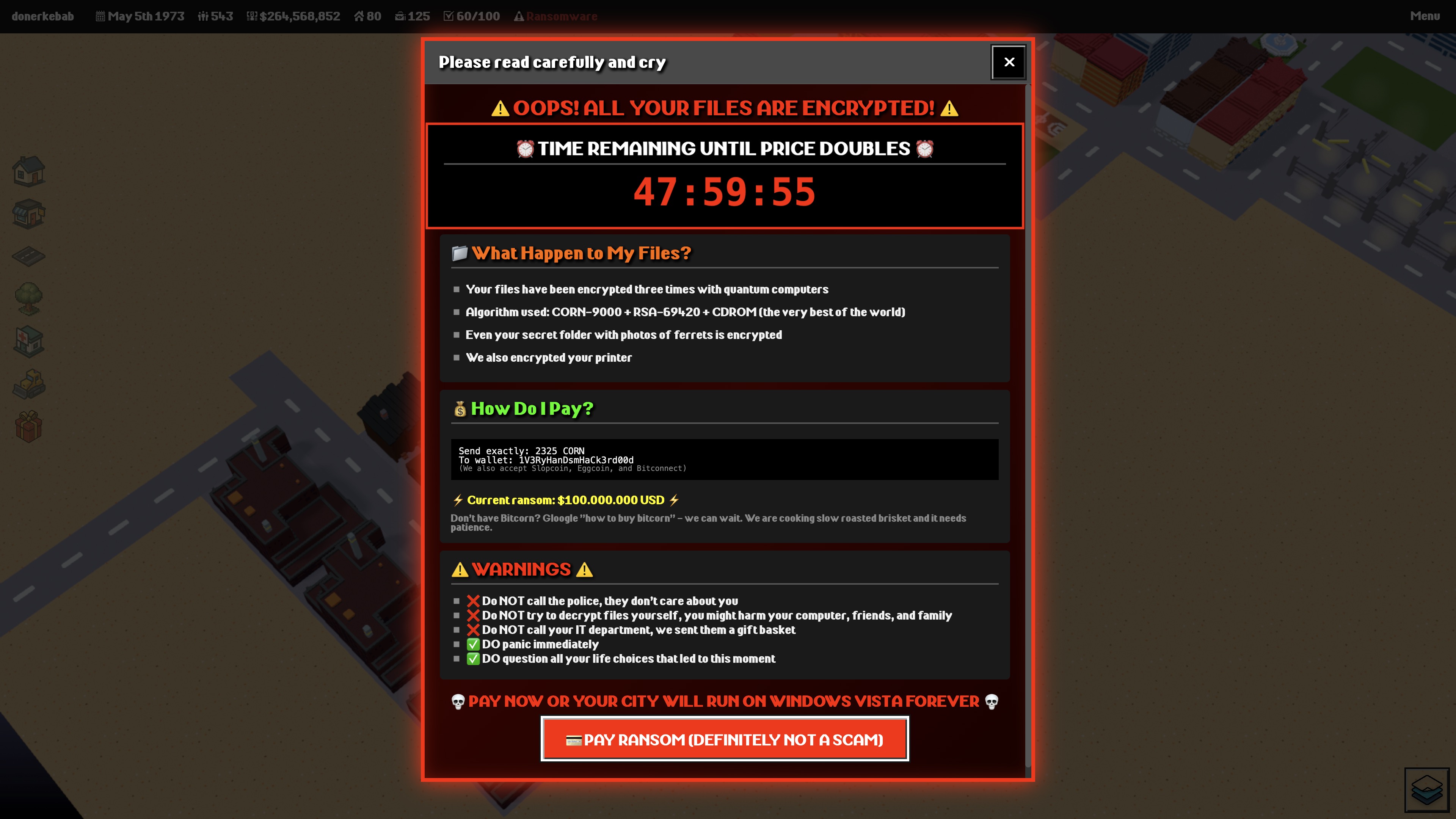 From time to time the city rolls an event, a change of rules in the simulation that creates extra difficulty or better luck: Ransomware locks your systems until you pay a lump sum, heatwaves multiply fires, recessions skim roughly twenty percent off company revenue, pandemics double hospital admissions. Good draws are “Summer of Love”, where births are double for one year, and “Tech Boom”, that doubles income for information sector firms.